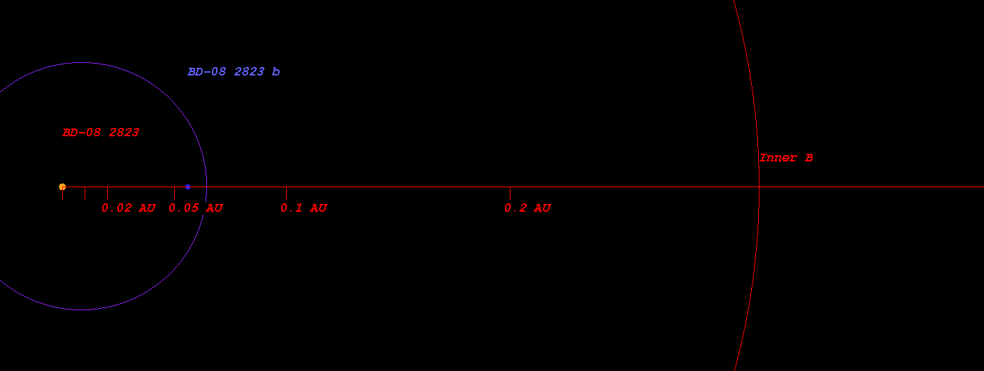 この恒星の惑星系で BD-08 2823 b は、恒星 BD-08 2823 のまわりを 公転周期5.6 日で、 軌道長半径 0.06 天文単位 ( 8377480.8 km)で公転しています。