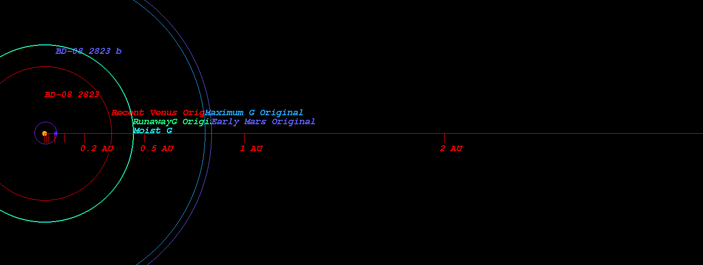 主星 BD-08 2823 のハビタブル・ゾーンは以下の位置にあります。