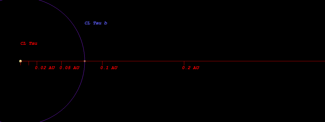 In this planetary system, the extrasolar planet CL Tau b orbits around the star CL Tau every 9.0 days with its orbital distance of 0.08 AU ( 11756489.2 km)