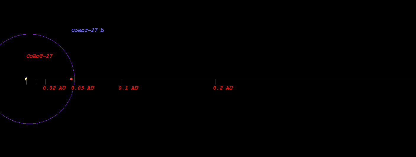 In this planetary system, the extrasolar planet CoRoT-27 b orbits around the star CoRoT-27 every 3.6 days with its orbital distance of 0.05 AU ( 7120858.6 km)