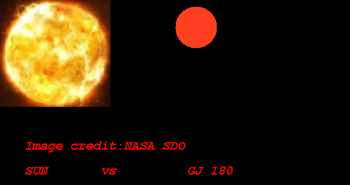 (太陽系相当天文単位(SEAU)によって計算された恒星GJ 180のハビタブルゾーン)