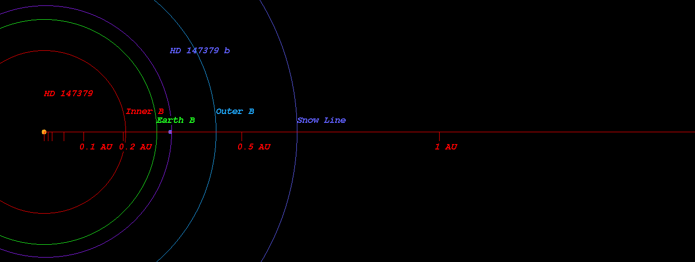 主星 HD 147379 のハビタブル・ゾーンは以下の位置にあります。