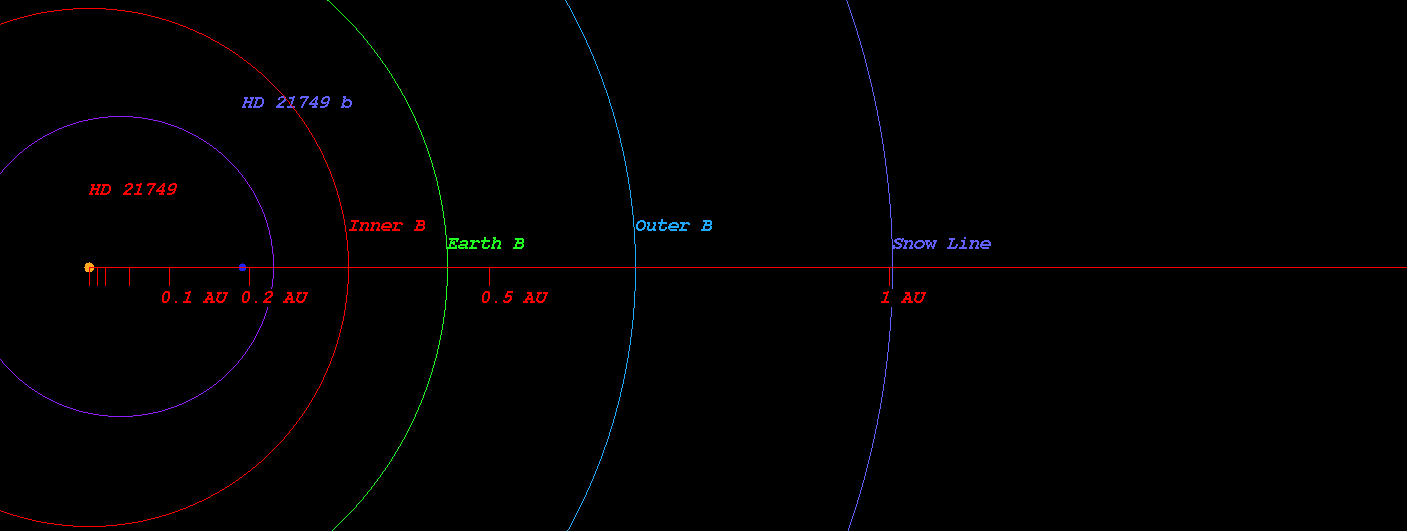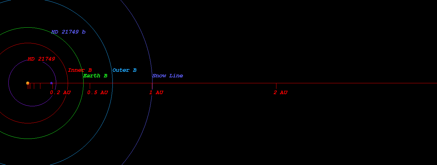 In this planetary system, the extrasolar planet HD 21749 b orbits around the star HD 21749 every 35.6 days with its orbital distance of 0.19 AU ( 28633032.5 km)