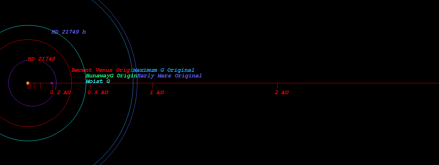 (Habitable zone calculated based on Kopparapu et al.(Original) around the star HD 21749)