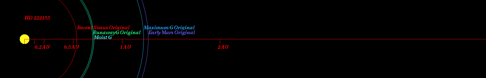 (太陽系相当天文単位(SEAU)によって計算された恒星HD 222155のハビタブルゾーン)