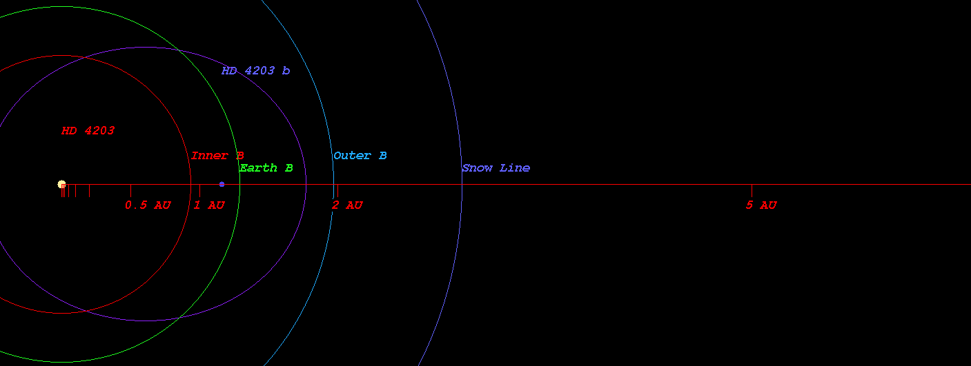 主星 HD 4203 のハビタブル・ゾーンは以下の位置にあります。