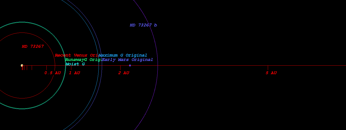 主星 HD 73267 のハビタブル・ゾーンは以下の位置にあります。