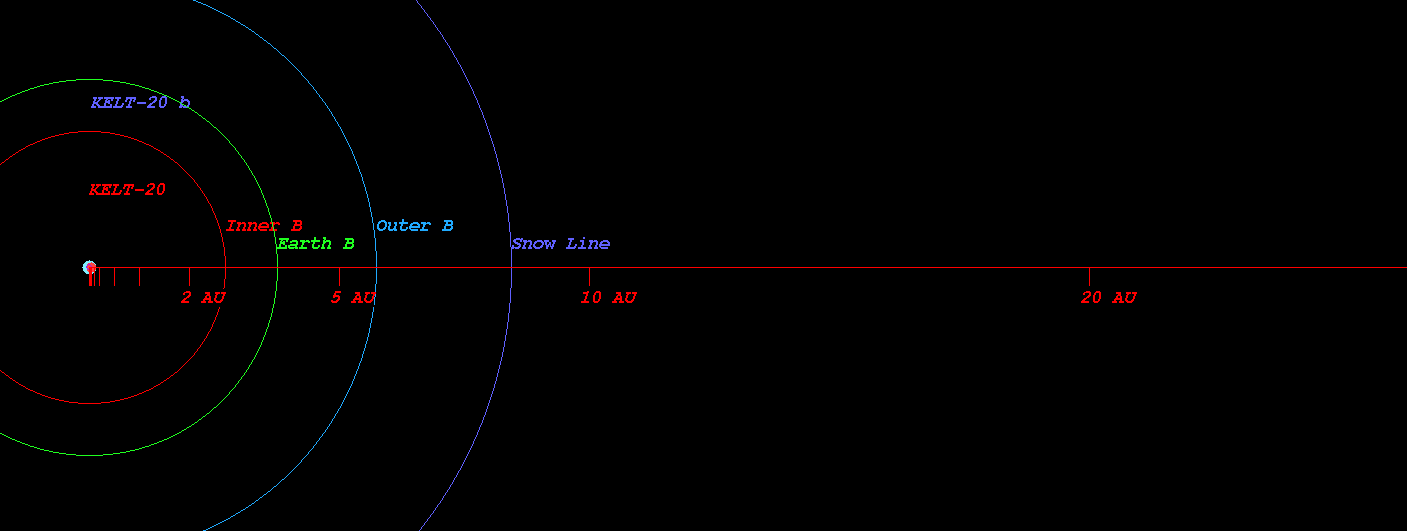 In this planetary system, the extrasolar planet KELT-20 b orbits around the star MASCARA-2 every 3.5 days with its orbital distance of 0.05 AU ( 8108204.6 km)