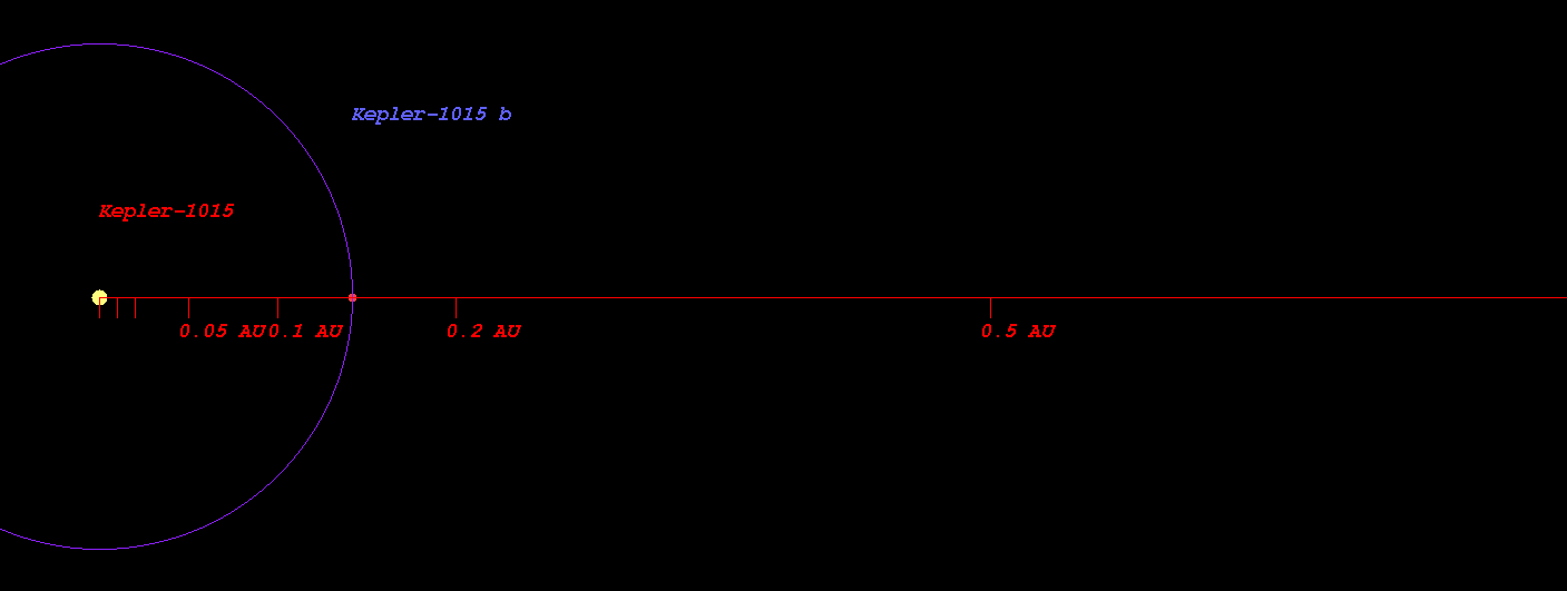 In this planetary system, the extrasolar planet Kepler-1015 b orbits around the star Kepler-1015 every 16.0 days with its orbital distance of 0.14 AU ( 21237175.6 km)