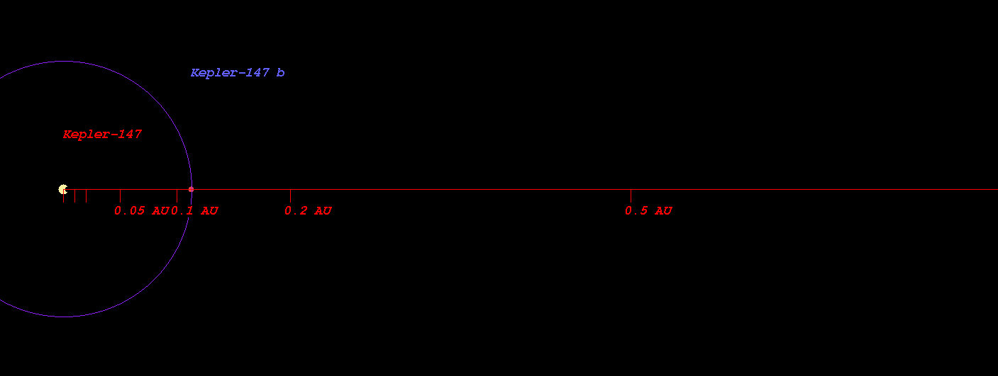 In this planetary system, the extrasolar planet Kepler-147 b orbits around the star Kepler-147 every 12.6 days with its orbital distance of 0.11 AU ( 16904559.4 km)