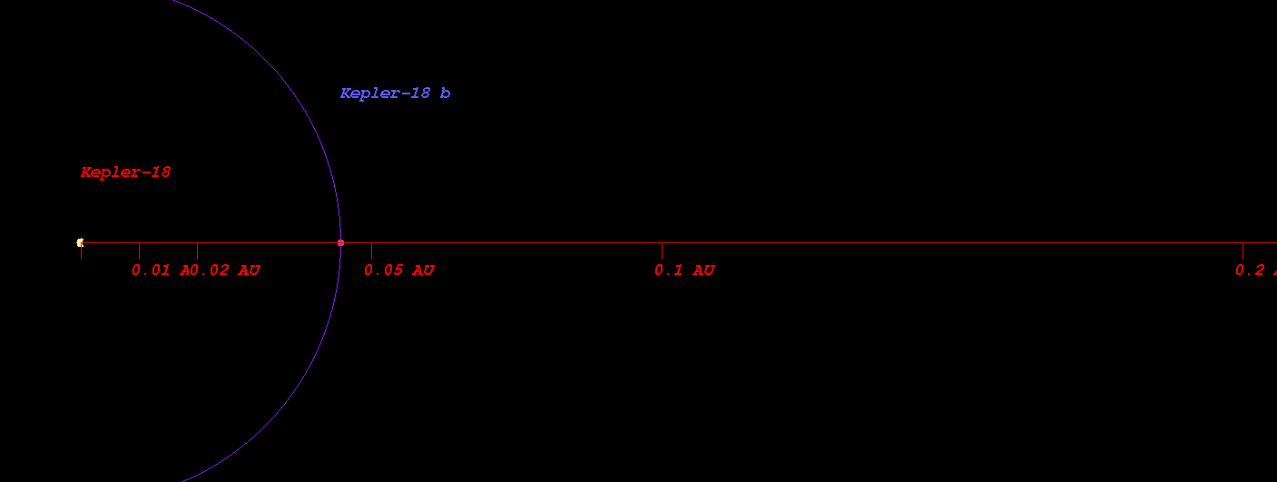 In this planetary system, the extrasolar planet Kepler-18 b orbits around the star Kepler-18 every 3.5 days with its orbital distance of 0.04 AU ( 6687024.8 km)