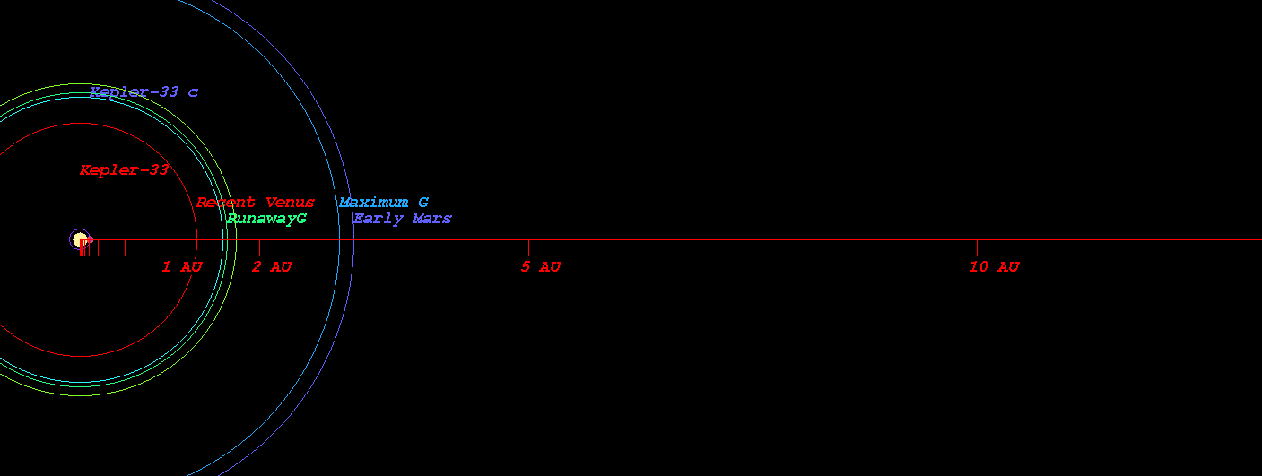 (Habitable zone calculated based on SEAU(Solar Equivalent Astronomical Unit) around the star Kepler-33)