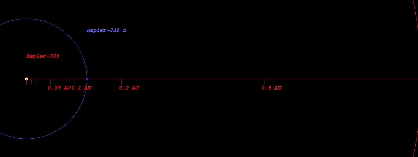 In this planetary system, the extrasolar planet Kepler-385 c orbits around the star Kepler-385 every 15.2 days with its orbital distance of 0.13 AU ( 18998929.6 km)