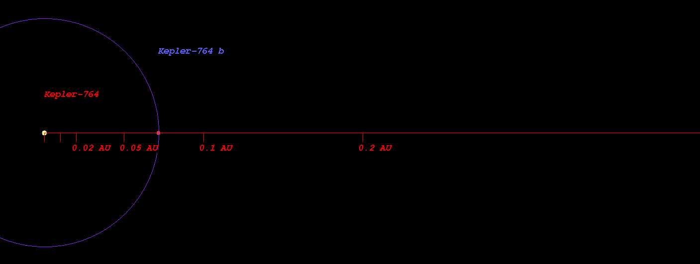 In this planetary system, the extrasolar planet Kepler-764 b orbits around the star Kepler-764 every 7.3 days with its orbital distance of 0.07 AU ( 10751454.3 km)