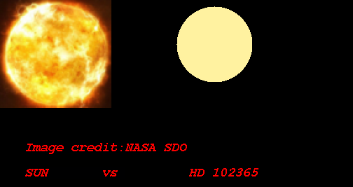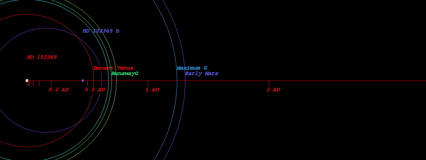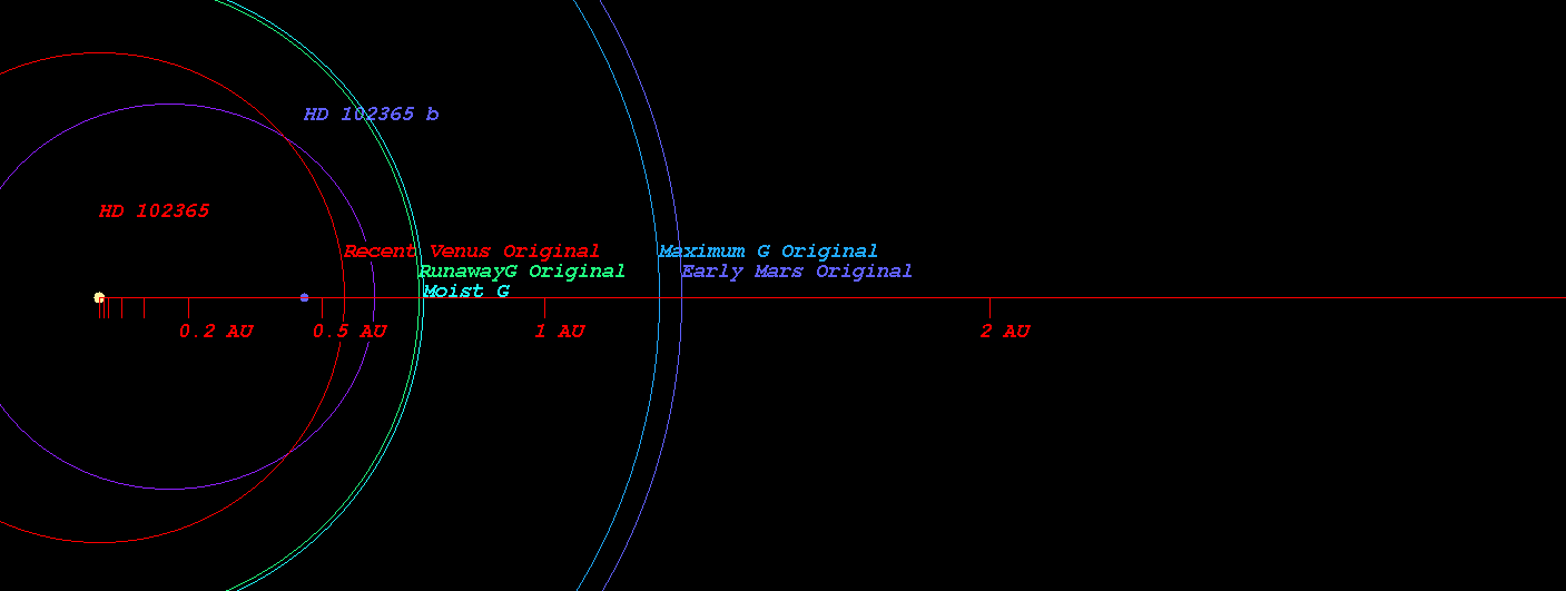 (太陽系相当天文単位(SEAU)によって計算された恒星HD 102365のハビタブルゾーン)