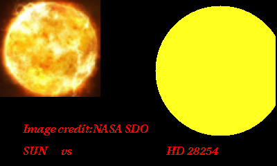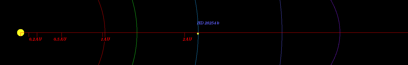 恒星 HD 28254 は太陽系から 178.3 光年 (54.7 パーセク) 離れています。 恒星 HD 28254 は視等級 7.7, 絶対等級 4.0 です。 また太陽の 1.1 倍の質量と、 1.5 倍の半径です。 表面温度は 5664ケルビンで、スペクトル型はG1IV/V です。 恒星系の系外惑星の数 : 1